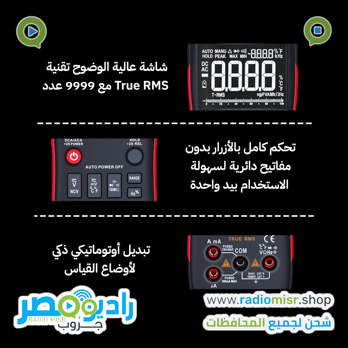 - قياسات شاملة ودقيقة:بيقيس كل حاجة ممكن تحتاجها: جهد وتيار متردد ومستمر (AC/DC)، مقاومة، مكثفات، تردد، ودرجة حرارة، كل ده بدقة عالية تصل إلى 9999 قراءة وخاصية True RMS لضمان أدق النتائج.