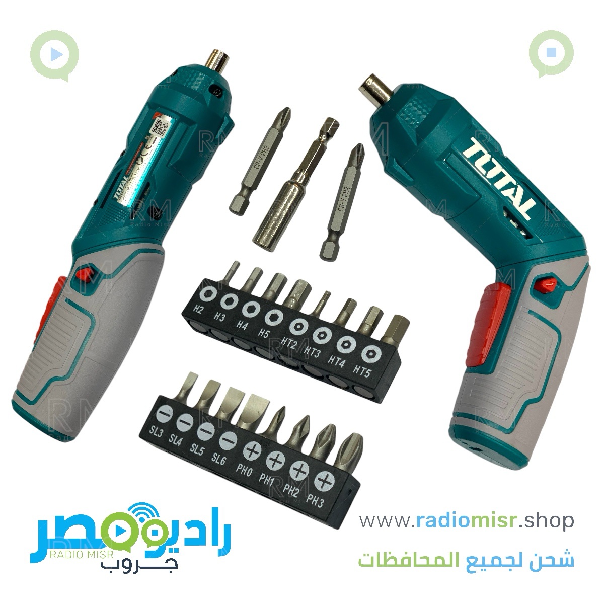 مفك كهربائي لاسيلكي TOTAL – مفك لاسلكي 4 فولت | مدخل 1/4 بوصة | وضعان للعمل | منفذ شحن USB من النوع C Tip| ضوء LED | يتضمن حقيبة بها 19 قطعه